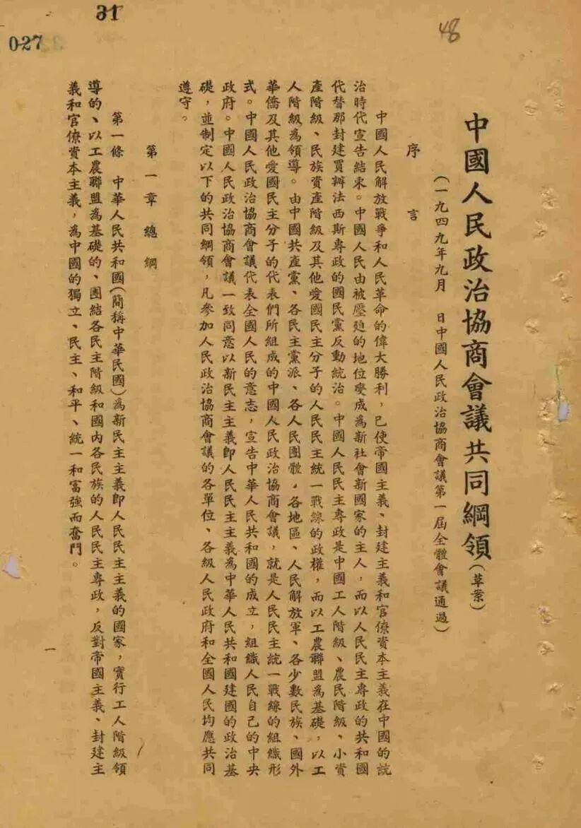 10月27日,在李维汉主持下,共同纲领形成第一稿,命名为《中国人民民主革命纲领草稿》。该文稿除简短的序言外,分为10部分,共46条,其中很多内容反映了长期以来形成的新民主主义的建国思想,大都为后来各个稿本所采纳。